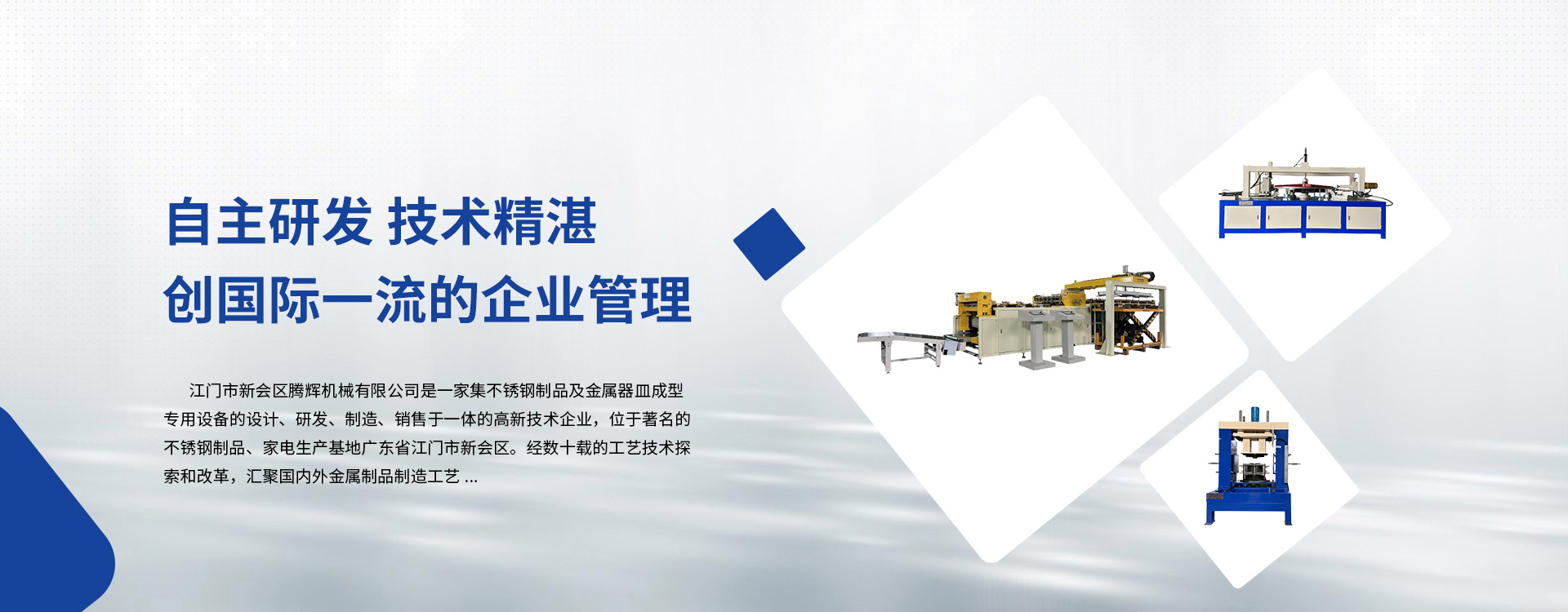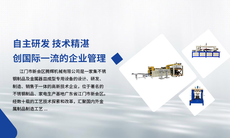 江門市新會區(qū)騰輝機(jī)械有限公司是一家集不銹鋼制品及金屬器皿成型專用設(shè)備的設(shè)計(jì)、研發(fā)、制造、銷售于一體的高新技術(shù)企業(yè),位于著名的不銹鋼制品、家電生產(chǎn)基地廣東省江門市新會區(qū)。經(jīng)數(shù)十載的工藝技術(shù)探索和改革,匯聚國內(nèi)外金屬制品制造工藝。